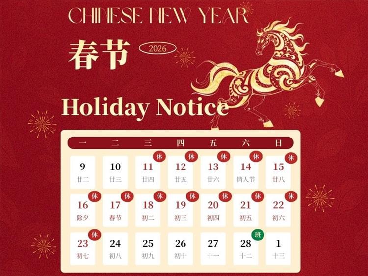 À l'approche du Nouvel An chinois 2026, nous tenons à vous remercier sincèrement pour votre confiance et votre collaboration. Veuillez prendre note des dates suivantes :